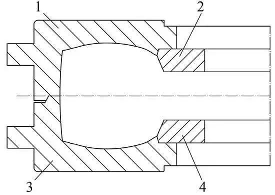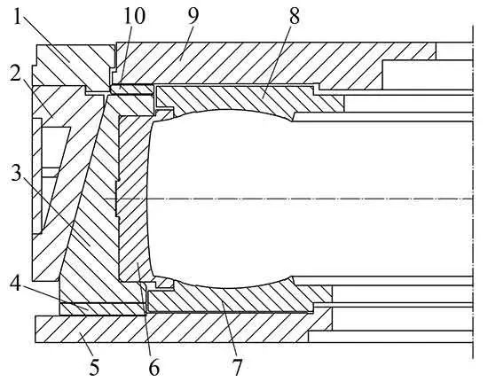 工業(yè)輪胎模具導向機構(gòu)的導向面為圓錐面的稱為圓錐面式活絡(luò)模具,與斜平面相比,圓錐面有良好的可加工性,普通的機床可滿足精度要求。圓錐面式模具的裝配精度要求較低,模具零件磨損后,周向偏差能夠自動補償,對硫化輪胎圓度影響小,對輪胎的膠邊和錯花問題影響也不明顯。但是模具開合過程中,弓形座和中模套上的耐磨板由線接觸逐漸過渡到圓錐面接觸,造成耐磨板不均勻磨損、模具動作不平穩(wěn)以及對硫化機的適應(yīng)性低。